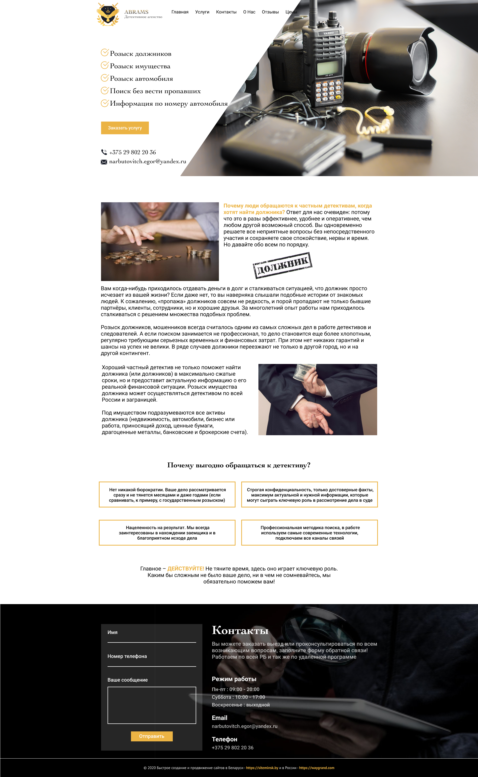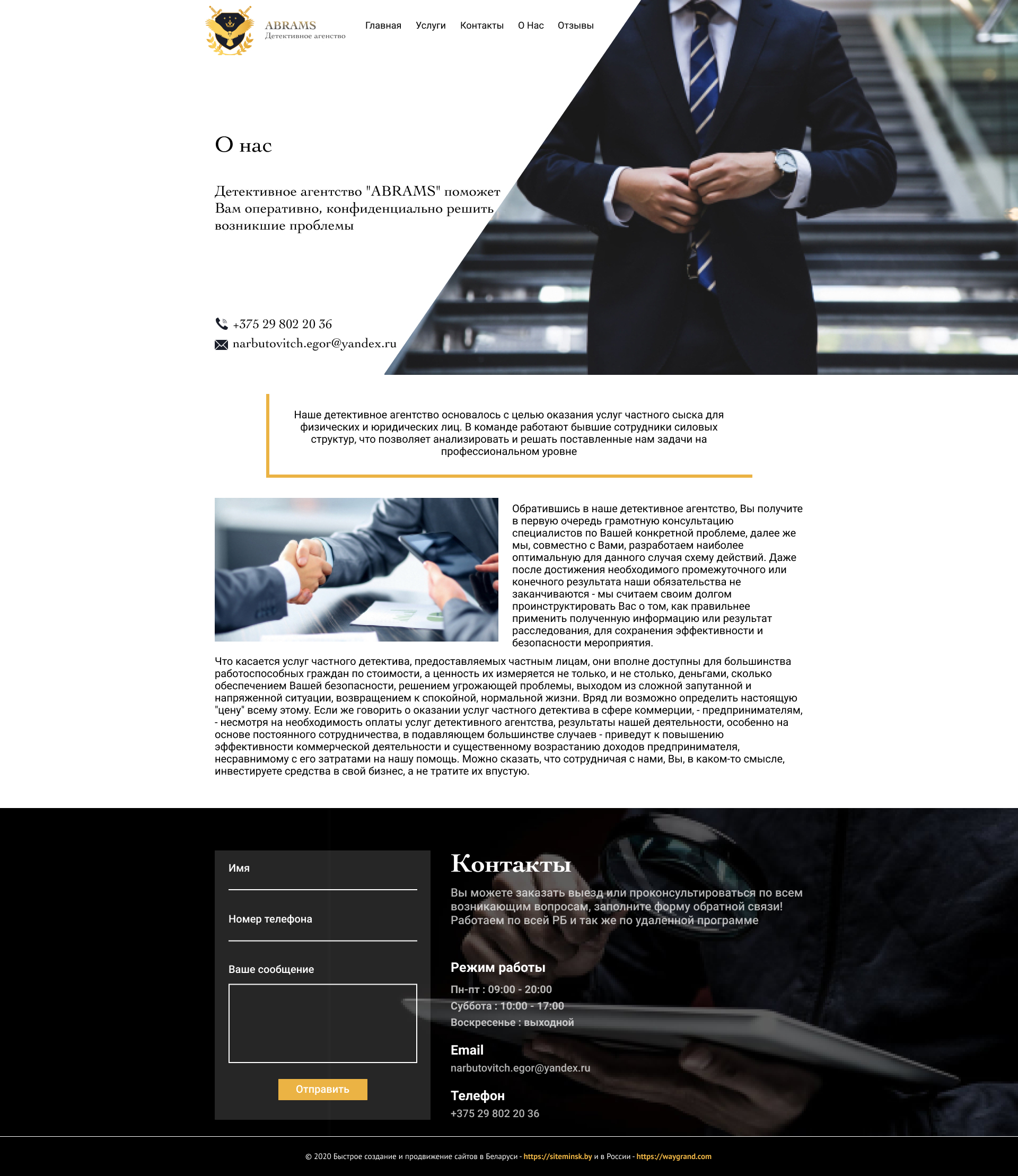 Закажите готовый продающий сайт визитка #239 в Бердске за 5-7 дня «под ключ»: свёрстан, отрисован и готов к рекламе. Тематика шаблона «Частное детективное агентство».